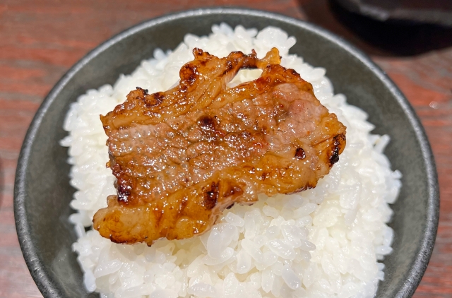 焼肉の濃厚なタレとご飯のシンプルな味わいが、絶妙なバランスで食欲をそそります。特に、タレの味が染み込んだご飯は、焼肉の美味しさをさらに引き立てます。